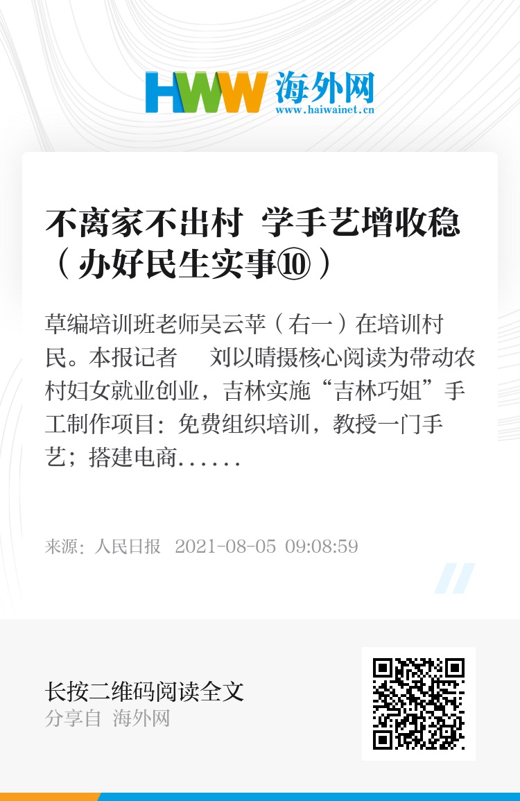 为带动农村妇女就业创业,吉林实施“吉林巧姐”手工制作项目:免费组织培训,教授一门手艺;搭建电商平台,拓宽产品销路;提供延伸服务,开展后续帮扶……越来越多的农村妇女通过参加培训学到一技之长,实现就业、稳定增收。