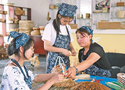 草编培训班老师吴云苹(右一)在培训村民。本报记者 刘以晴摄