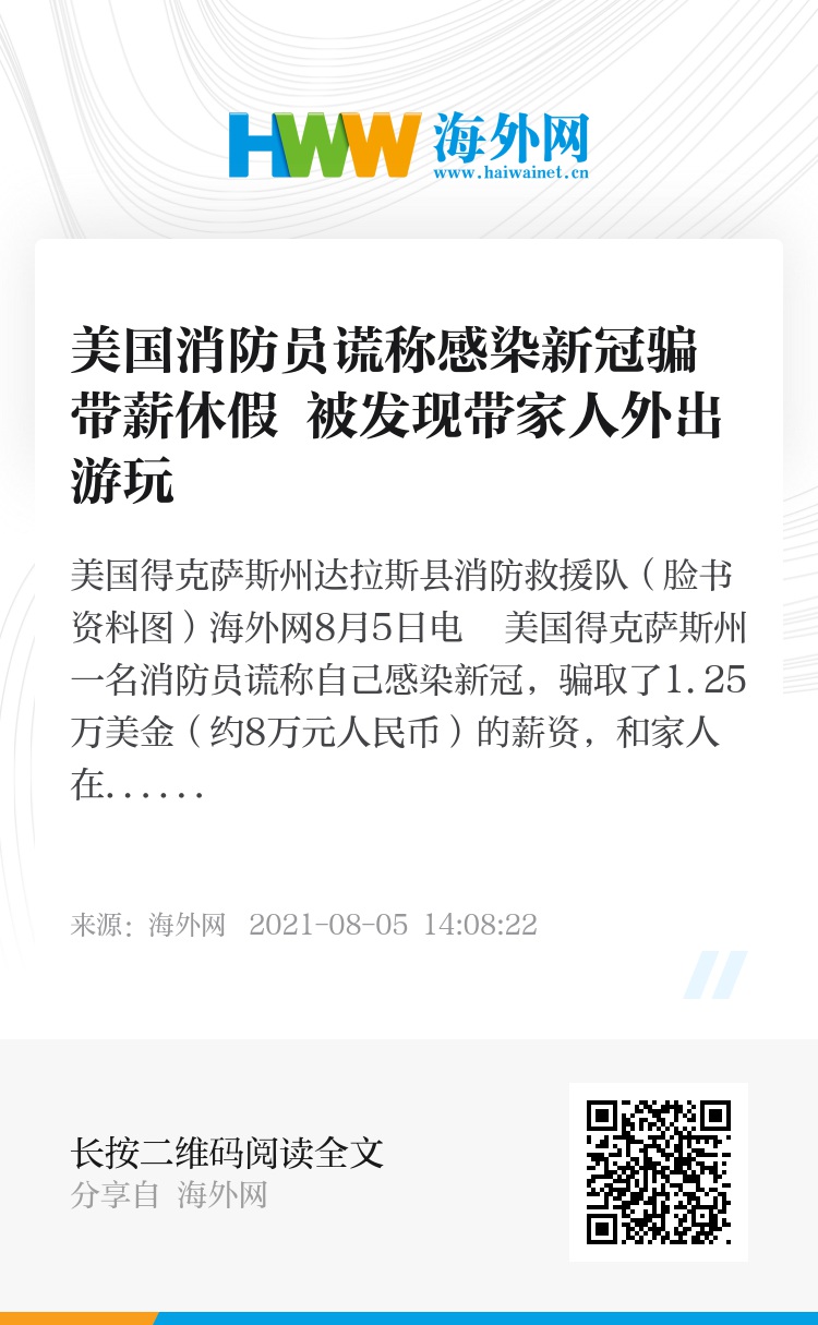 海外网8月5日电 美国得克萨斯州一名消防员谎称自己感染新冠,骗取了1.25万美金(约8万元人民币)的薪资,和家人在水上乐园玩乐。事件曝光后,这名消防员已于近日被捕。
