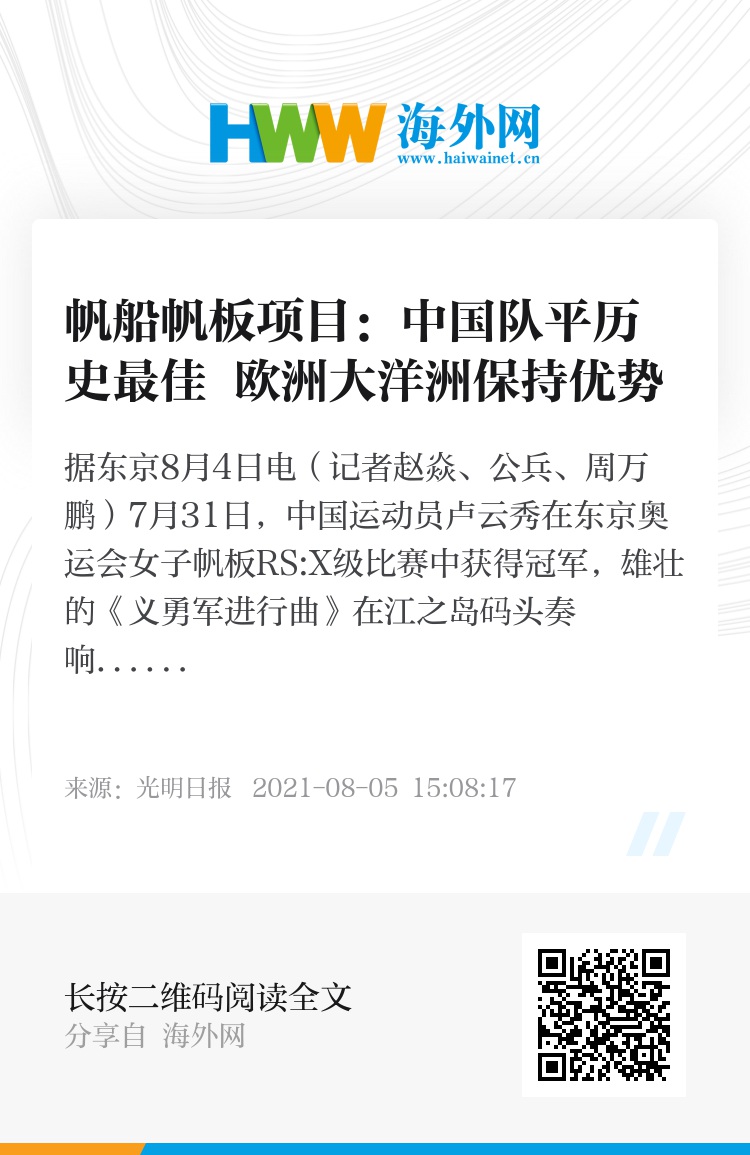 据新华社东京8月4日电(记者赵焱、公兵、周万鹏)7月31日,中国运动员卢云秀在东京奥运会女子帆板RS:X级比赛中获得冠军,雄壮的《义勇军进行曲》在江之岛码头奏响。
