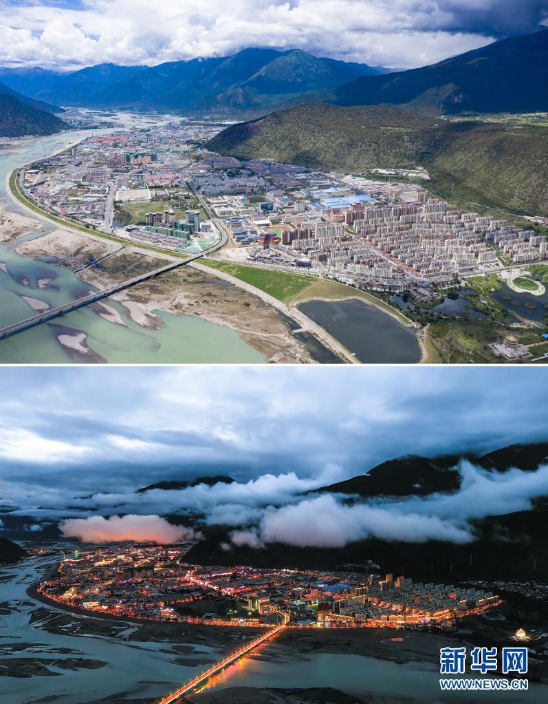 拼版照片:上图7月19日拍摄的林芝市景色(无人机照片,新华社记者 普布扎西 摄);下图为6月4日拍摄的林芝市夜景(无人机照片,新华社发 董志雄 摄)。新华社发