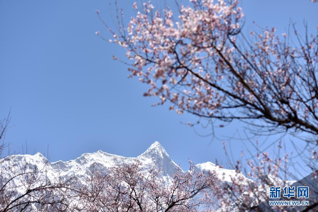 这是3月28日拍摄的桃花掩映下的南迦巴瓦峰。新华社记者 孙瑞博 摄