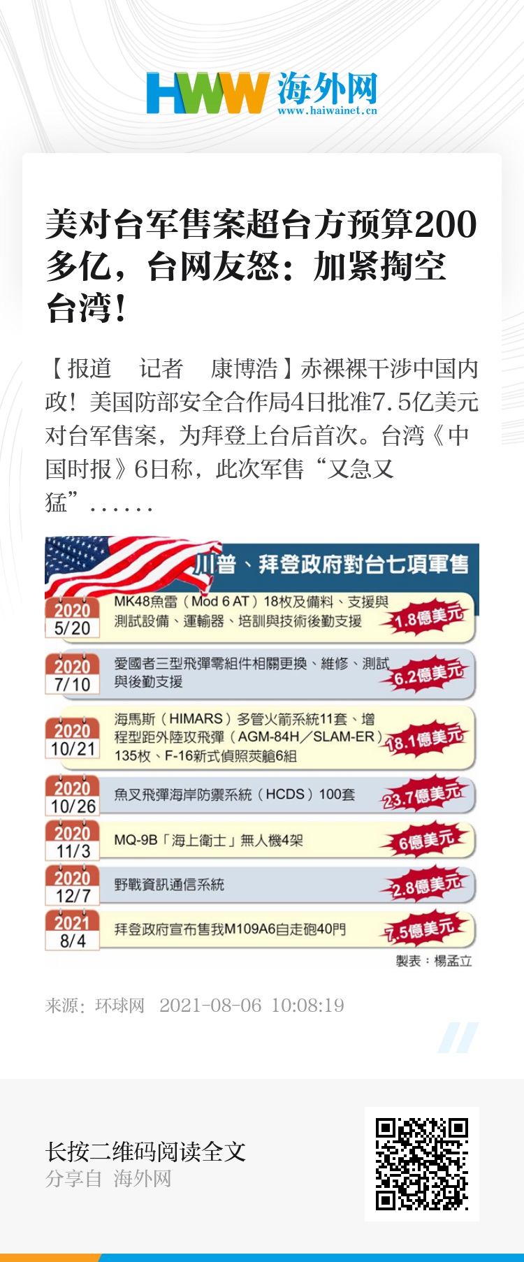 【环球网报道 记者 康博浩】赤裸裸干涉中国内政!美国防部安全合作局4日批准7.5亿美元对台军售案,为拜登上台后首次。台湾《中国时报》6日称,此次军售“又急又猛”,不论是民进党当局要的,或是美方为打造台湾为“军事堡垒”,而主动提供的武器装备,几乎是“台湾要什么给什么”,导致台军方预算吃紧,只能勒紧裤带,减量减项采购。