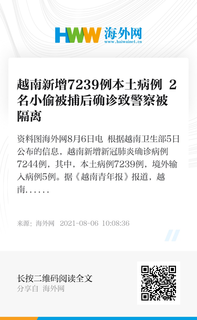 海外网8月6日电 根据越南卫生部5日公布的信息,越南新增新冠肺炎确诊病例7244例,其中,本土病例7239例,境外输入病例5例。
