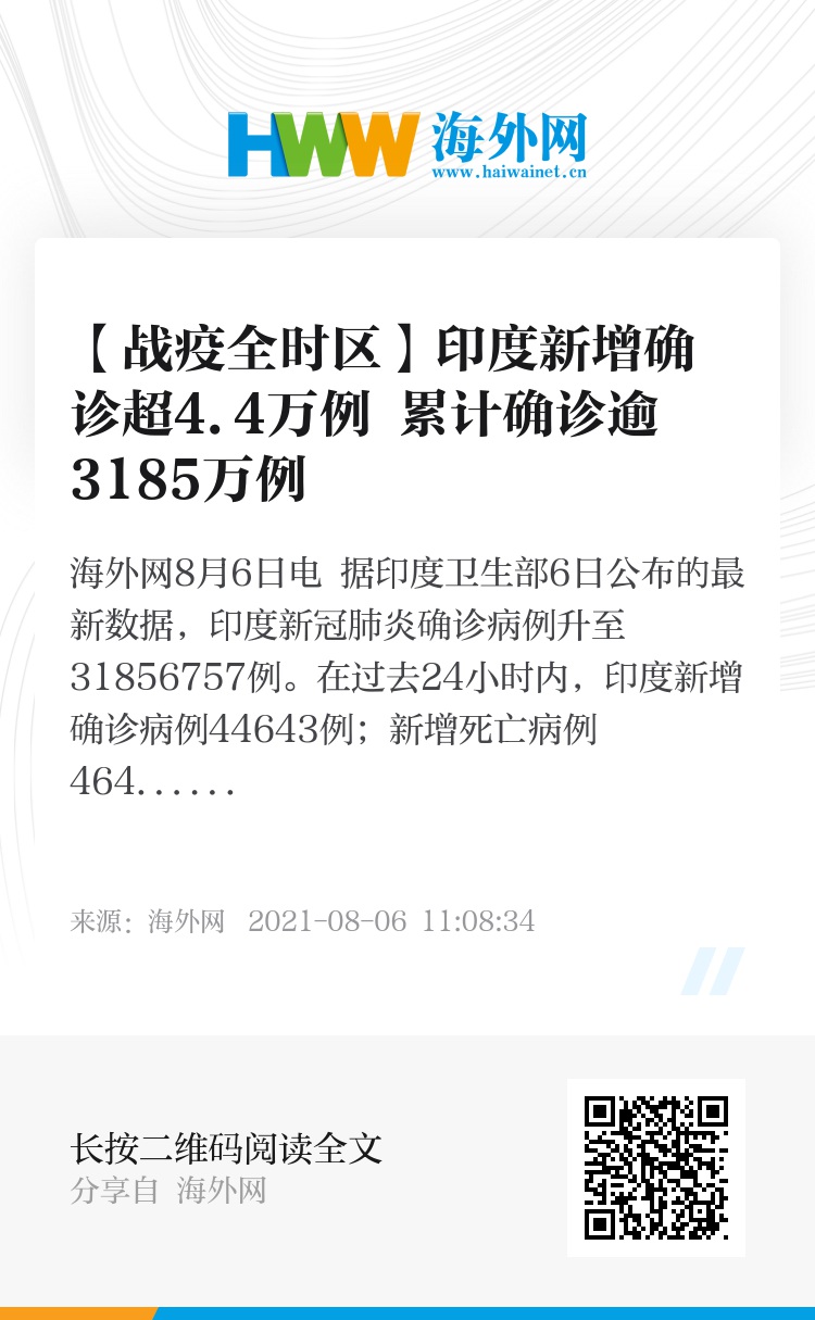 海外网8月6日电 据印度卫生部6日公布的最新数据,印度新冠肺炎确诊病例升至31856757例。在过去24小时内,印度新增确诊病例44643例;新增死亡病例464例,累计死亡病例达426754例。(海外网 王西洛)