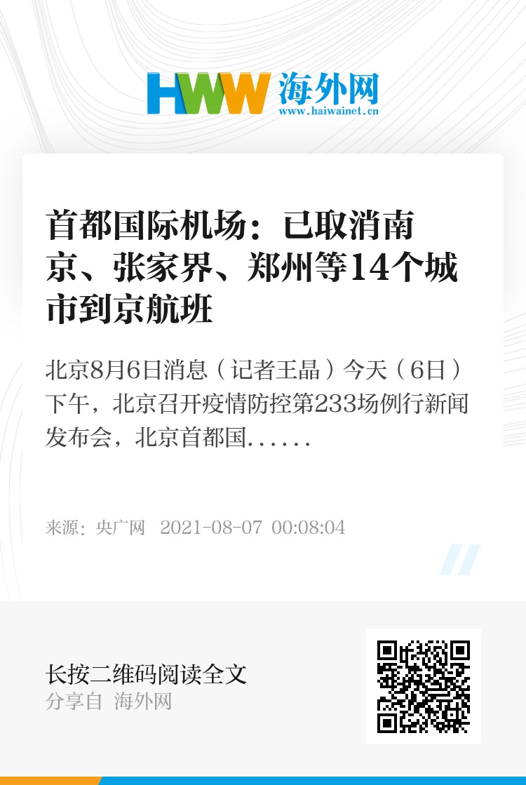 赵莹介绍,由于各地疫情防控政策和市场需求因素,目前各航空公司已取消了相关城市到首都国际机场的航班,涉及到的城市包括:南京、扬州、淮安、张家界、常德、郑州、德宏、宜宾、泸州、沈阳、芜湖、成都(天府机场)、海口、荆州。
