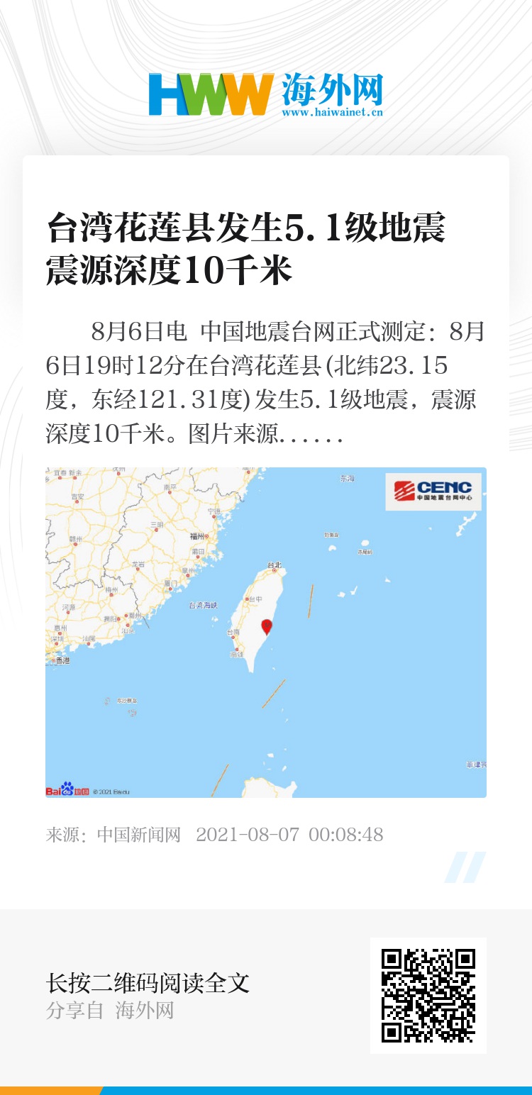 中新网8月6日电 中国地震台网正式测定:8月6日19时12分在台湾花莲县(北纬23.15度,东经121.31度)发生5.1级地震,震源深度10千米。