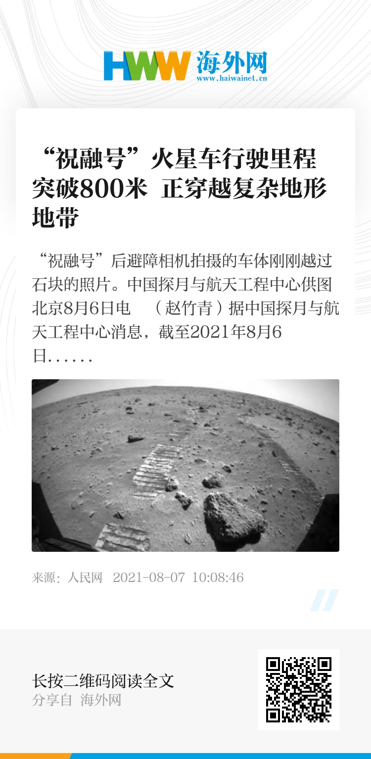 人民网北京8月6日电 (赵竹青)据中国探月与航天工程中心消息,截至2021年8月6日,“祝融号”火星车在火星表面工作82个火星日,累计行驶里程突破800米(808米)。