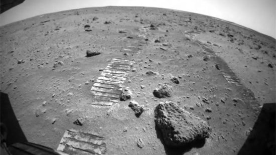 “祝融号”后避障相机拍摄的车体刚刚越过石块的照片。中国探月与航天工程中心供图