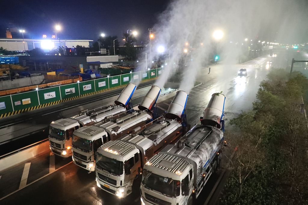 8月6日晚,郑州市城市管理局组织各区环卫部门利用各类喷雾车设施对市区重点区域和主要道路进行防疫专项消杀,全力预防和控制病媒生物传播性疾病的发生、阻断病毒传播途径、抑制新冠肺炎疫情蔓延。图为8月6日晚,郑州火车站西广场旁的京广快速路上,各类喷雾车设施正在进行消杀工作。图片来源:人民视觉