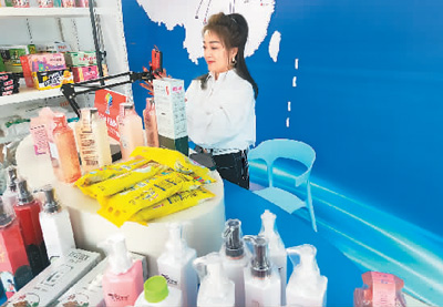 近年来,山东省聊城经开区打造兴农电商直播小镇,依托平台电商、直播电商等渠道发展数字经济,助力乡村振兴。目前,兴农电商直播小镇已入驻企业140多家,新增就业岗位3000余个。图为兴农电商直播小镇的电商主播在直播卖货。 薛蓓蓓摄(人民视觉)