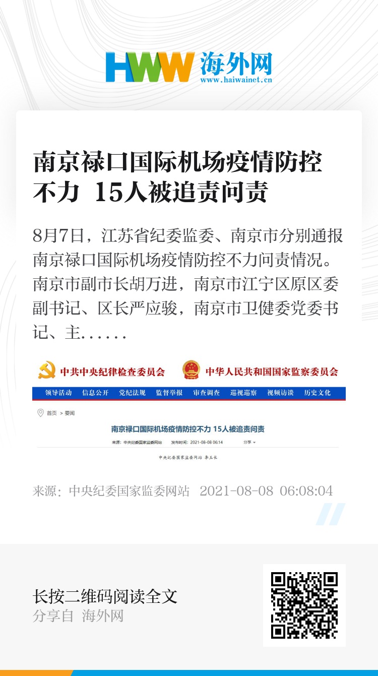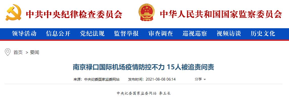 8月7日,江苏省纪委监委、南京市分别通报南京禄口国际机场疫情防控不力问责情况。南京市副市长胡万进,南京市江宁区原区委副书记、区长严应骏,南京市卫健委党委书记、主任方中友等15名党员干部和公职人员被追责问责。其中,江苏省纪委监委问责6人,南京市问责9人。