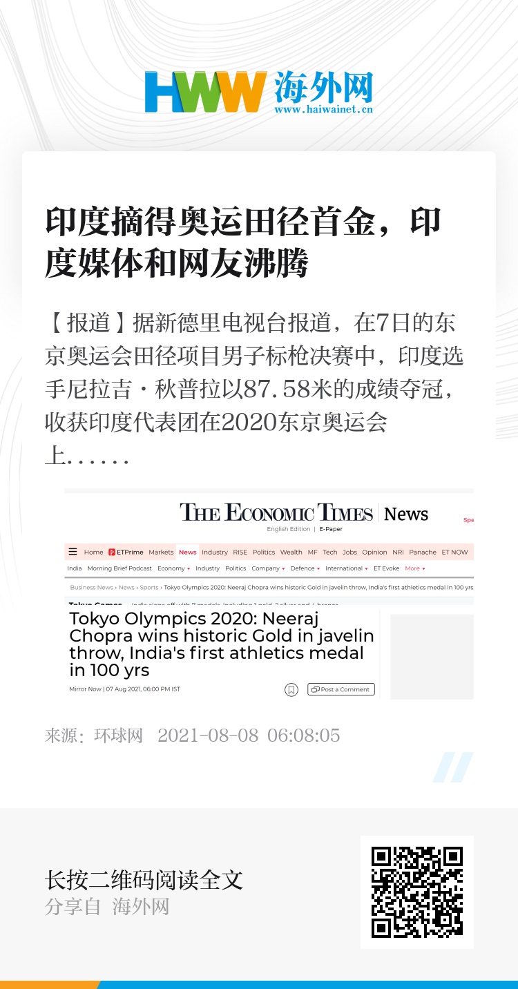 印度《经济时报》:2020年东京奥运会: 秋普拉在标枪比赛中获得历史性的金牌,这是印度百年来的首枚田径奖牌