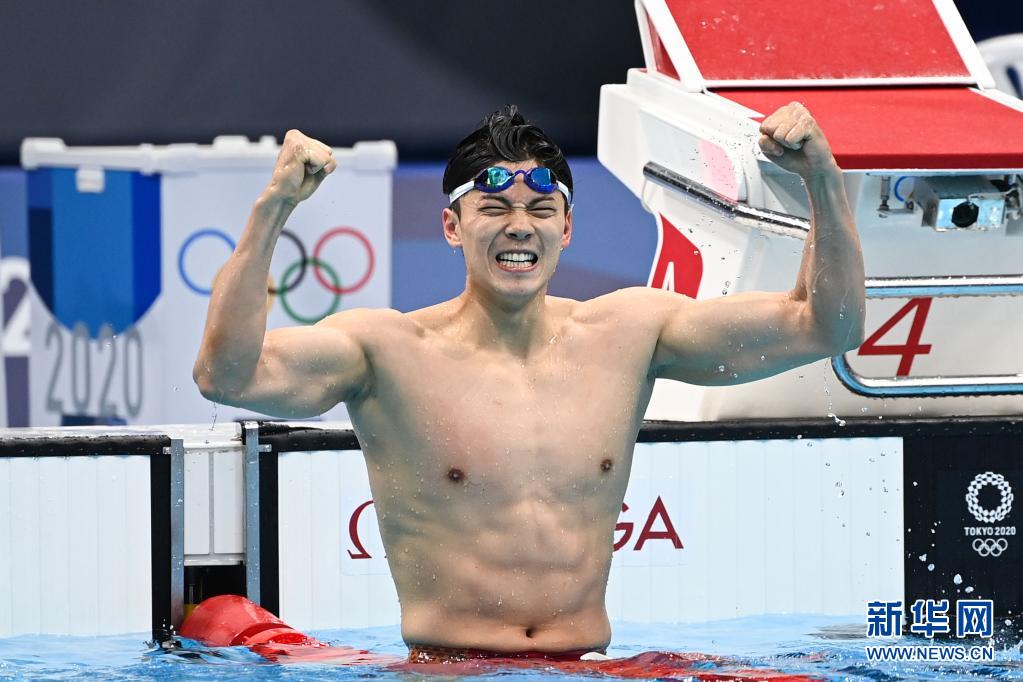 7月30日,汪顺在东京奥运会游泳男子200米个人混合泳决赛中夺冠后庆祝。新华社记者 杜宇 摄