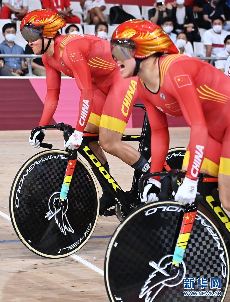 8月2日,中国选手钟天使(左)和鲍珊菊在东京奥运会场地自行车女子团体竞速赛中出发。新华社记者 贺长山 摄