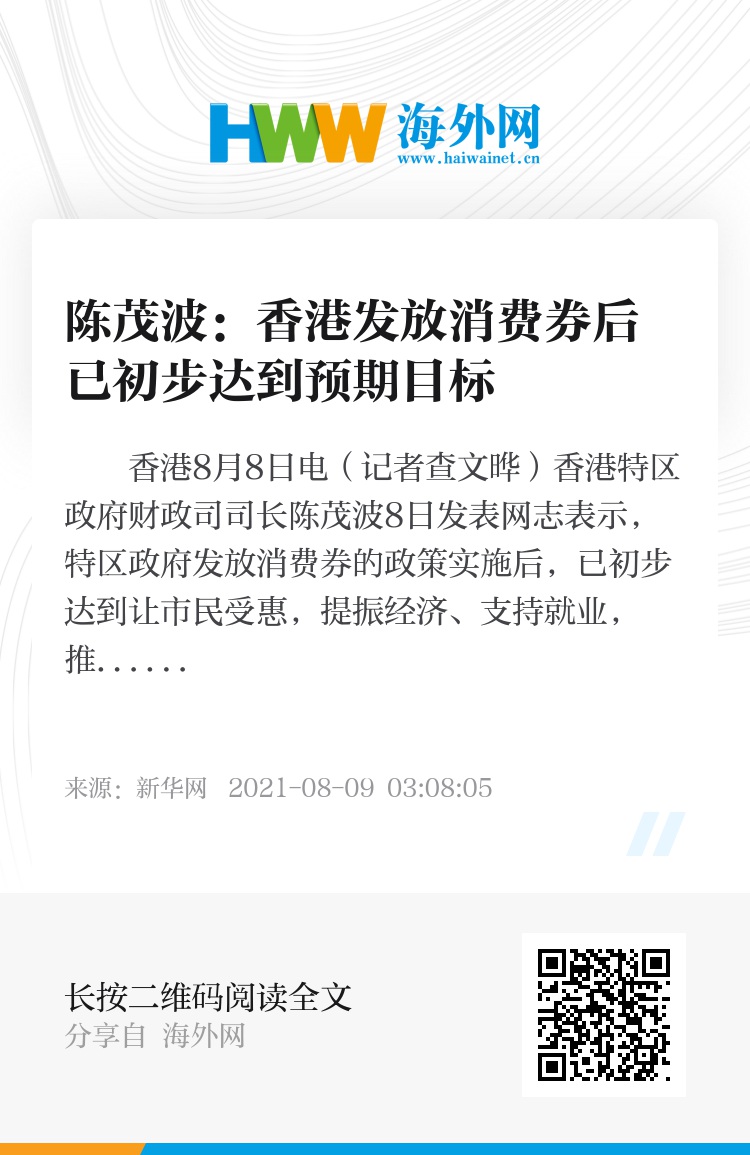 新华社香港8月8日电(记者查文晔)香港特区政府财政司司长陈茂波8日发表网志表示,特区政府发放消费券的政策实施后,已初步达到让市民受惠,提振经济、支持就业,推动电子支付广泛应用的预期目标。