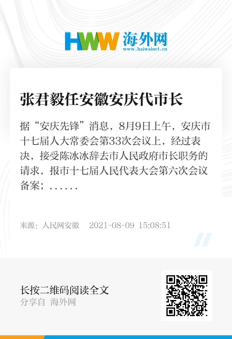 据“安庆先锋”消息,8月9日上午,安庆市十七届人大常委会第33次会议上,经过表决,接受陈冰冰辞去市人民政府市长职务的请求,报市十七届人民代表大会第六次会议备案;决定张君毅代理市长。