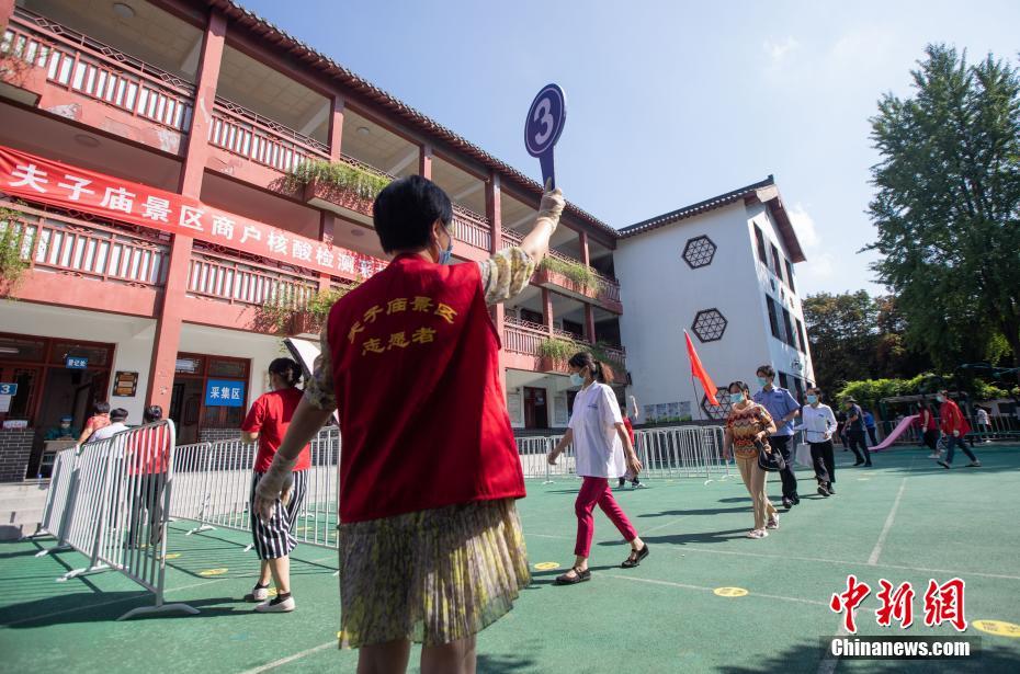8月8日,在南京城南一处核酸检测点内,市民间隔一米排队准备进行核酸检测。当日,南京市启动第六轮部分区域大范围核酸检测。 中新社记者 泱波 摄