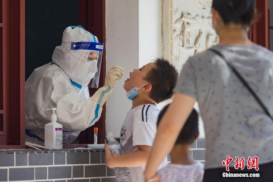 8月8日,在南京城南一处核酸检测点内,市民间隔一米排队准备进行核酸检测。当日,南京市启动第六轮部分区域大范围核酸检测。 中新社记者 泱波 摄