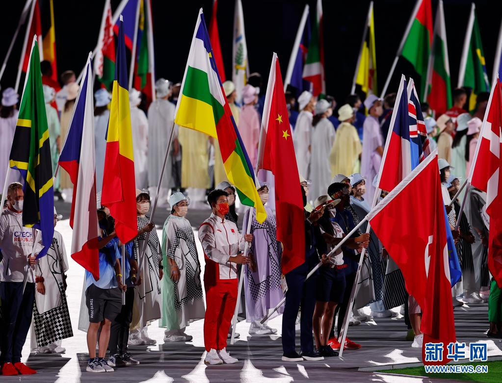 8月8日,第32届夏季奥林匹克运动会闭幕式在日本东京举行。这是中国代表团旗手苏炳添(中)进入体育场(8月8日摄)。新华社记者 王丽莉 摄
