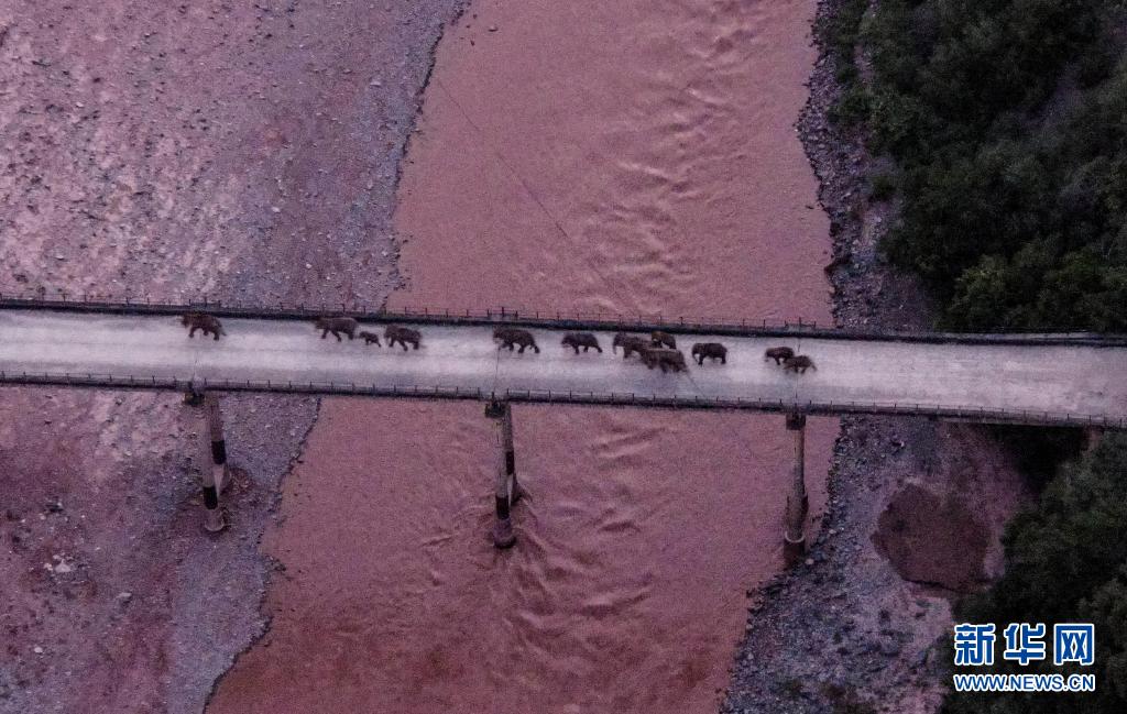 象群通过老213国道元江桥(无人机照片,8月8日摄)。新华社发