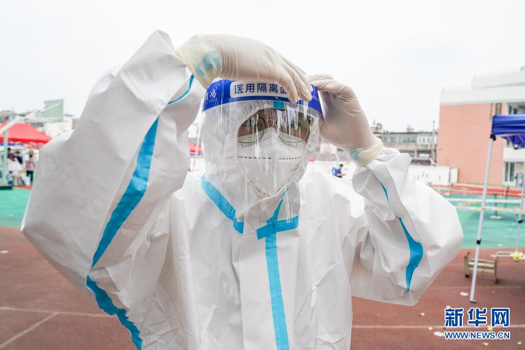 8月9日,在扬州市广陵区汶河街道龙头关社区育才小学采样点,一位负责登记居民信息的社区工作人员穿戴医用隔离面罩。新华社记者 李博 摄