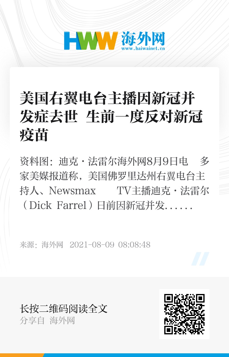 海外网8月9日电 多家美媒报道称,美国佛罗里达州右翼电台主持人、Newsmax TV主播迪克·法雷尔(Dick Farrel)日前因新冠并发症去世,生前曾一度坚定反对新冠疫苗。