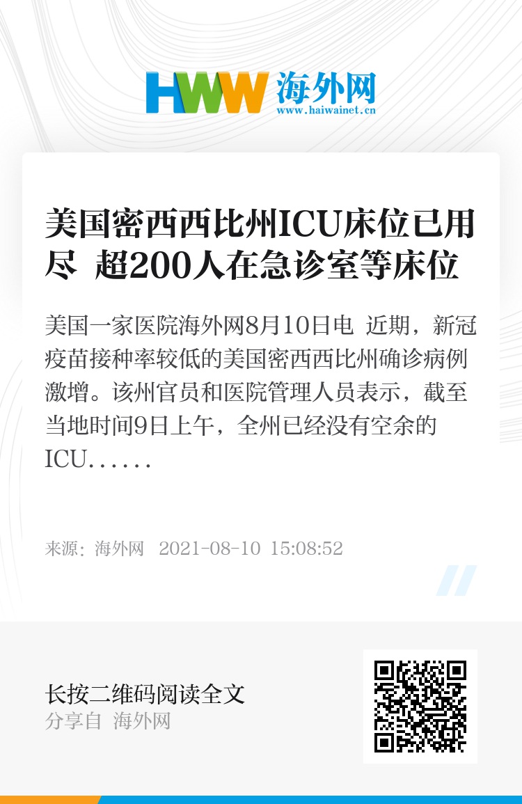 海外网8月10日电 近期,新冠疫苗接种率较低的美国密西西比州确诊病例激增。该州官员和医院管理人员表示,截至当地时间9日上午,全州已经没有空余的ICU(重症监护)病床。