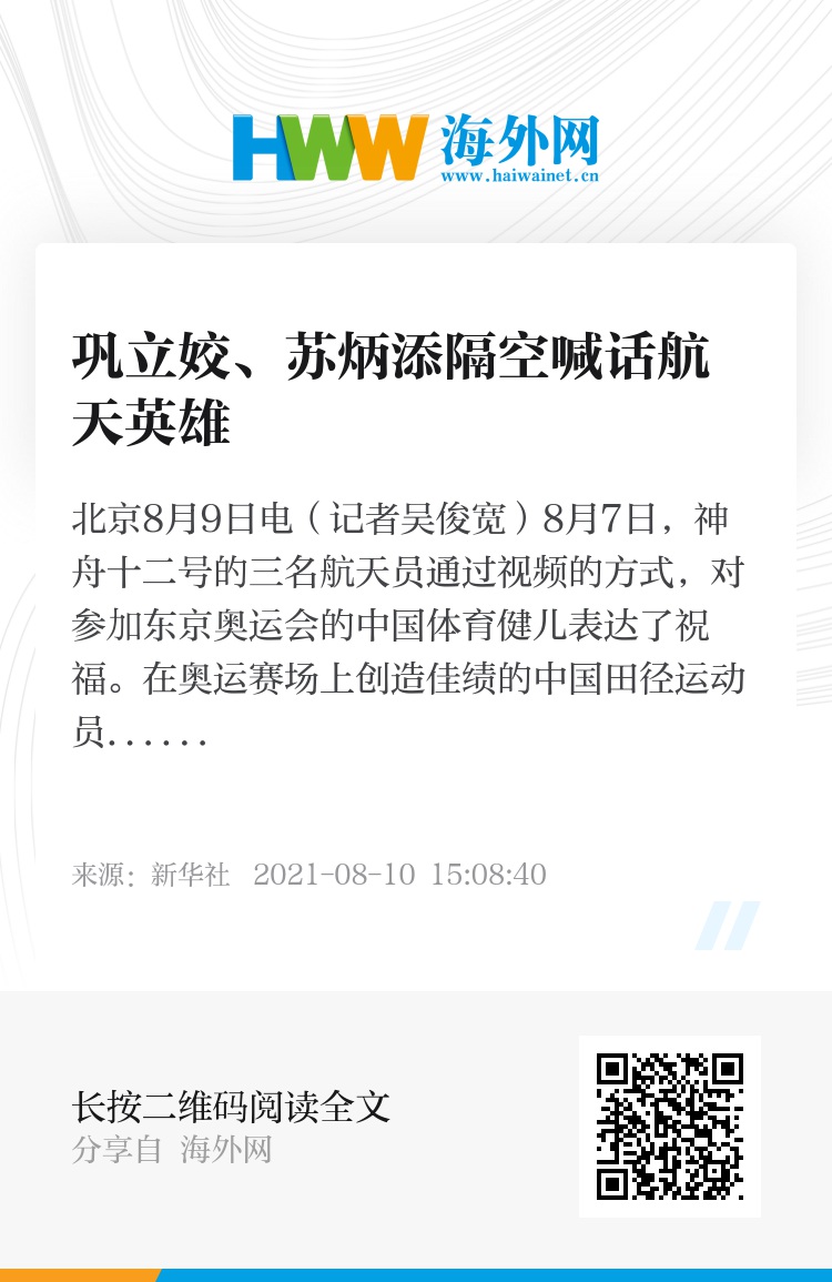 新华社北京8月9日电(记者吴俊宽)8月7日,神舟十二号的三名航天员通过视频的方式,对参加东京奥运会的中国体育健儿表达了祝福。在奥运赛场上创造佳绩的中国田径运动员巩立姣、苏炳添9日也以视频的形式与航天英雄进行跨越天地的隔空互动。