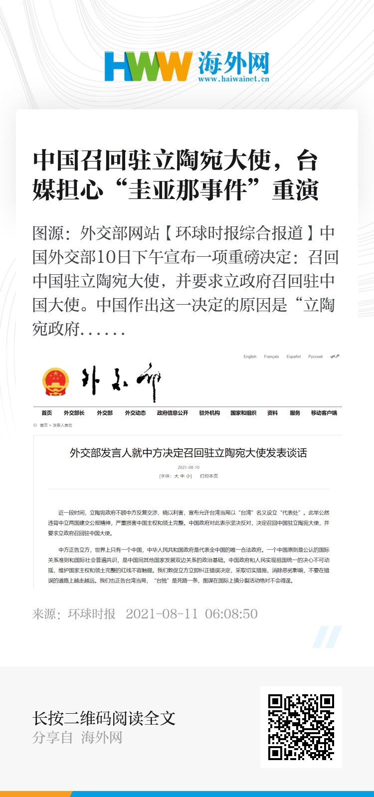 中国外交部官网10日刊登“外交部发言人就中方决定召回驻立陶宛大使发表谈话”新闻稿称,近一段时间,立陶宛政府不顾中方反复交涉、晓以利害,宣布允许台湾当局以“台湾”名义设立“代表处”。中国政府对此表示坚决反对,决定召回中国驻立陶宛大使,并要求立政府召回驻中国大使。