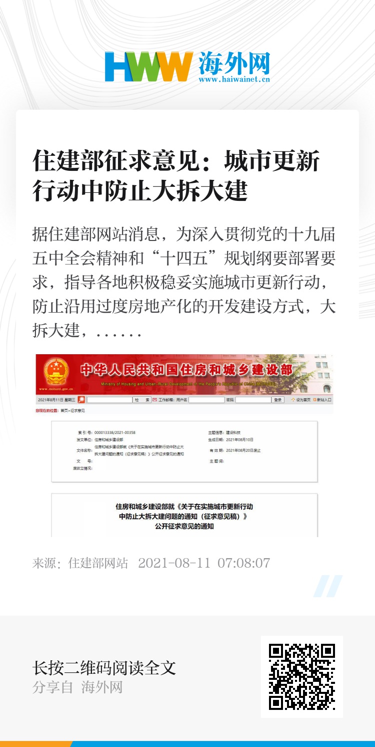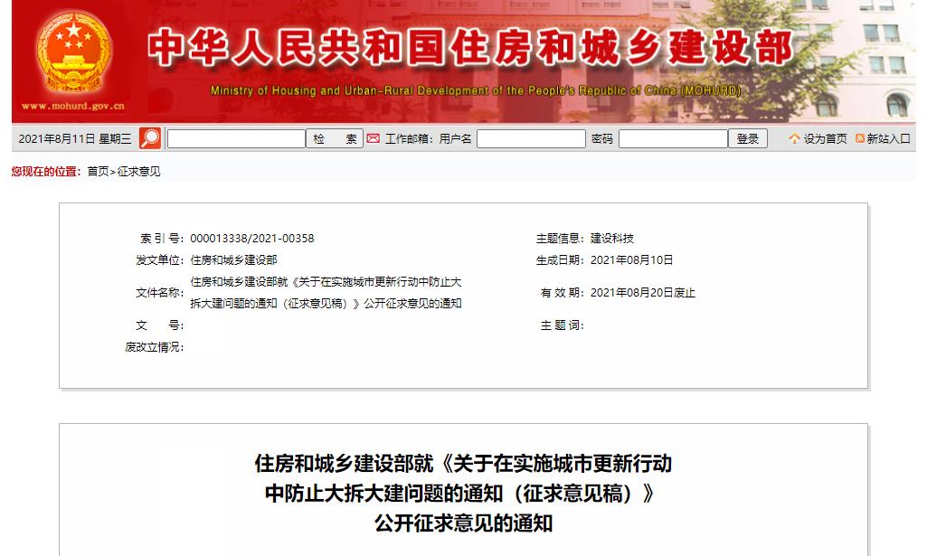 据住建部网站消息,为深入贯彻党的十九届五中全会精神和“十四五”规划纲要部署要求,指导各地积极稳妥实施城市更新行动,防止沿用过度房地产化的开发建设方式,大拆大建,急功近利等问题,我部研究起草了《关于在实施城市更新行动中防止大拆大建问题的通知》,现向社会公开征求意见。公众可在2021年8月20日前,通过以下途径和方式提出意见: