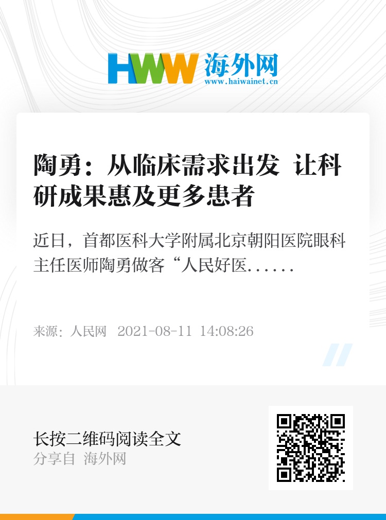 近日,首都医科大学附属北京朝阳医院眼科主任医师陶勇做客“人民好医生”客户端。他表示,临床医生科研创新需从临床需求出发,让更多科研成果转化落地,提升诊疗水平和服务能力,惠及更多患者。