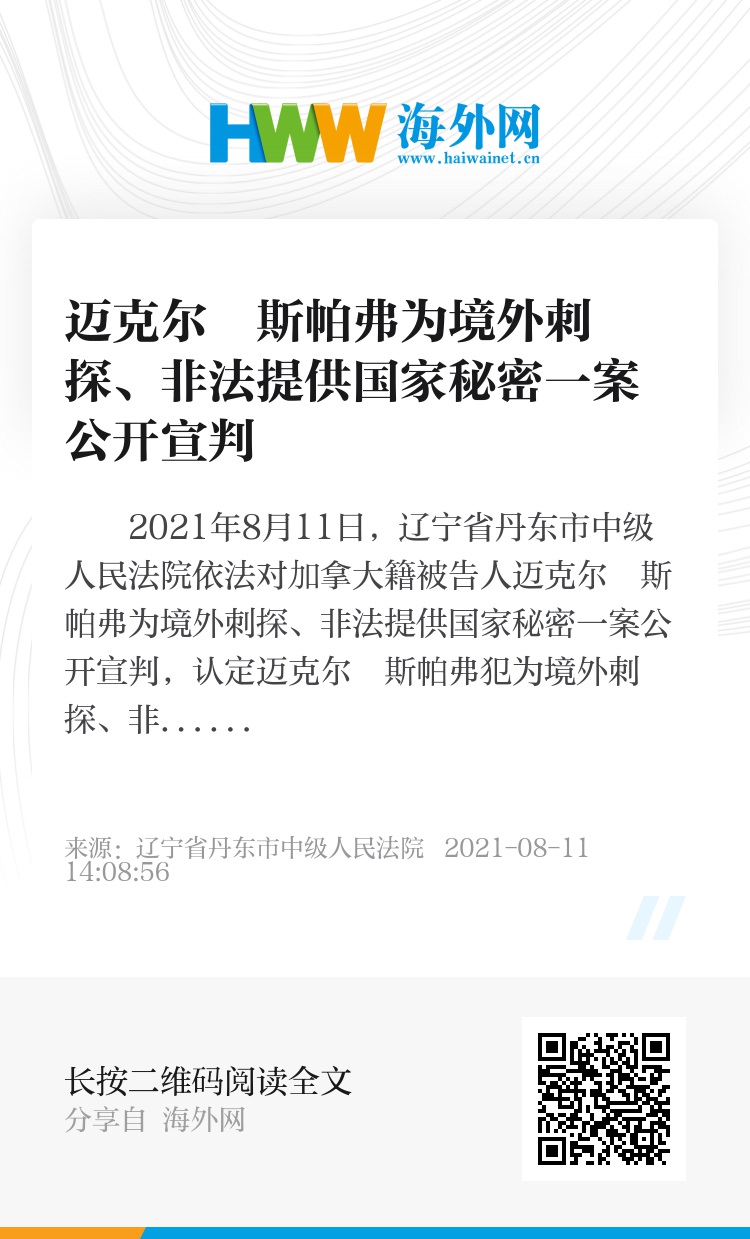 2021年8月11日,辽宁省丹东市中级人民法院依法对加拿大籍被告人迈克尔・斯帕弗为境外刺探、非法提供国家秘密一案公开宣判,认定迈克尔・斯帕弗犯为境外刺探、非法提供国家秘密罪,判处有期徒刑十一年,并处没收个人财产人民币五万元,驱逐出境。