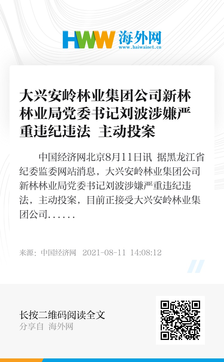 中国经济网北京8月11日讯 据黑龙江省纪委监委网站消息,大兴安岭林业集团公司新林林业局党委书记刘波涉嫌严重违纪违法,主动投案,目前正接受大兴安岭林业集团公司纪委纪律审查和大兴安岭地区监察委员会监察调查。
