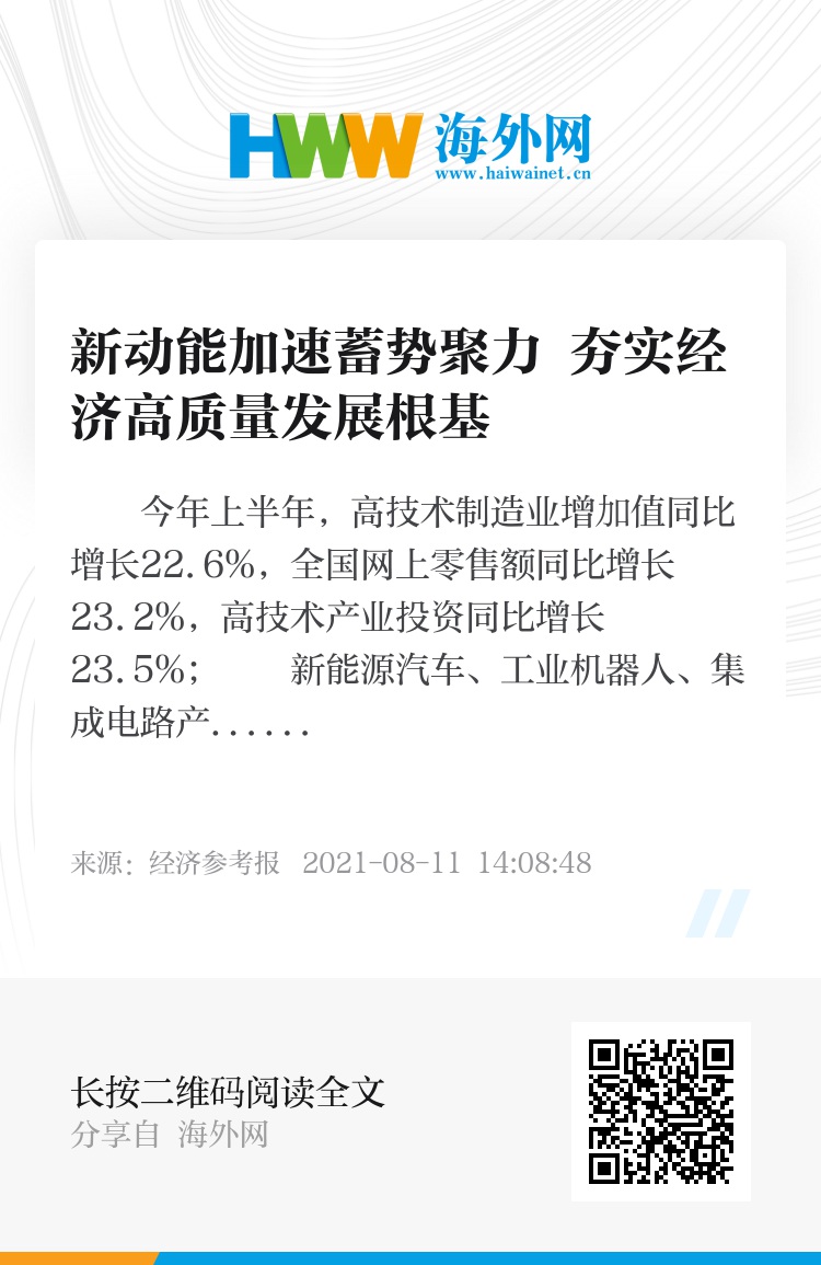 今年上半年,高技术制造业增加值同比增长22.6%,全国网上零售额同比增长23.2%,高技术产业投资同比增长23.5%;