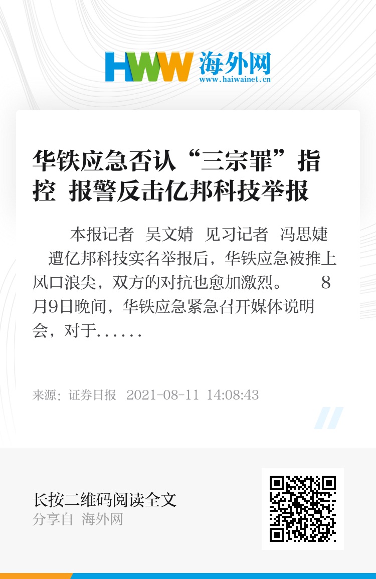 华铁应急董秘郭海滨向记者表示,公司与亿邦科技之间本质上属于商业纠纷。关于亿邦科技提出的相关猜测,公司一直在与监管层进行密切沟通,进行了详细的解释和汇报。另外,就相关不实言论,公司已向公安机关报案,切实维护中小股东利益。