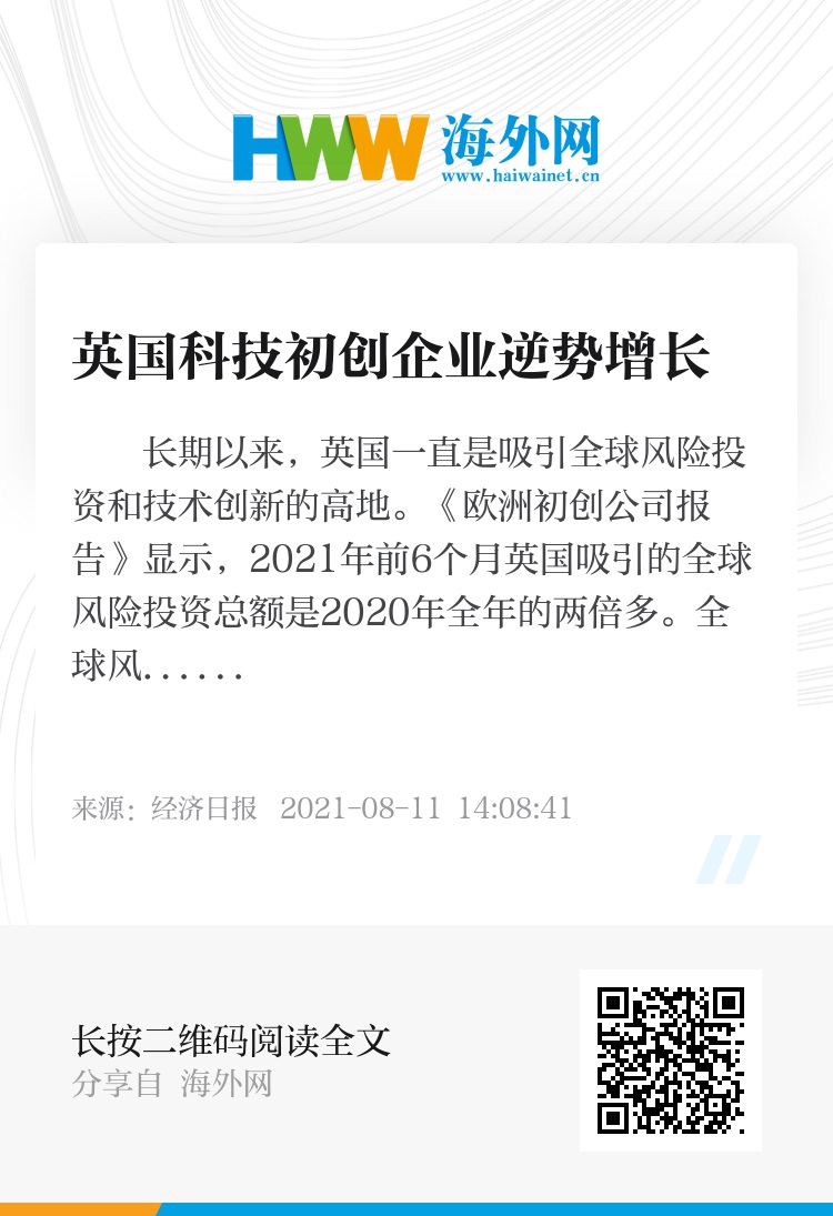 长期以来,英国一直是吸引全球风险投资和技术创新的高地。《欧洲初创公司报告》显示,2021年前6个月英国吸引的全球风险投资总额是2020年全年的两倍多。全球风投资金的涌入,看中的是英国科技创新的前景。2018年以来,英国在金融科技、电子商务、医疗健康等新兴领域涌现出一批科技初创企业。2020年2月份开始暴发的新冠肺炎疫情也未放缓伦敦、曼彻斯特、利兹等英国制造和科技创新中心发展的步伐。