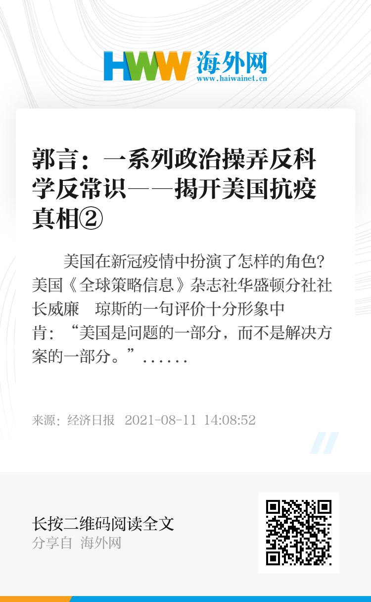 美国在新冠疫情中扮演了怎样的角色?美国《全球策略信息》杂志社华盛顿分社社长威廉・琼斯的一句评价十分形象中肯:“美国是问题的一部分,而不是解决方案的一部分。”美国政府在疫情发生后的一系列反科学反常识“操作”,便是这句评语的最好注释。