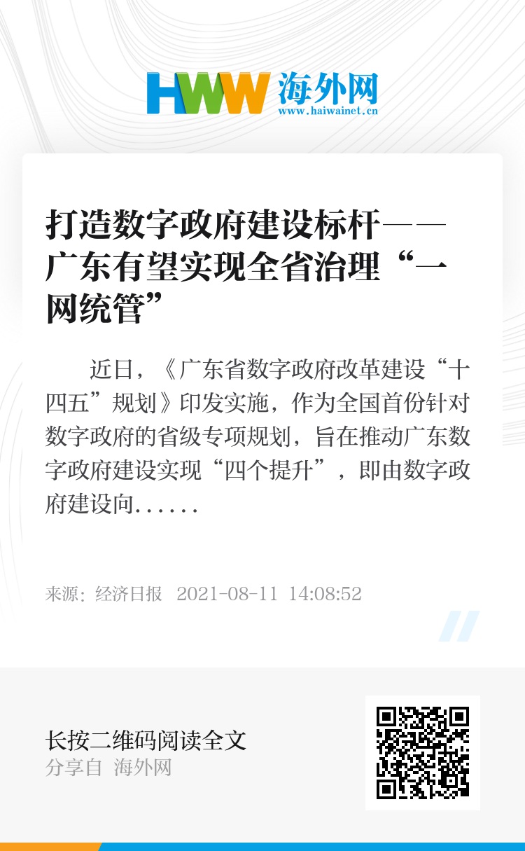 近日,《广东省数字政府改革建设“十四五”规划》印发实施,作为全国首份针对数字政府的省级专项规划,旨在推动广东数字政府建设实现“四个提升”,即由数字政府建设向全面数字化发展提升;由数字化向智慧化提升;由侧重政务服务向治理与服务并重提升;由数据资源管理向数据资产开发利用提升。到2025年,广东将全面建成“智领粤政、善治为民”的格局,让改革发展成果更多更公平惠及全体人民。