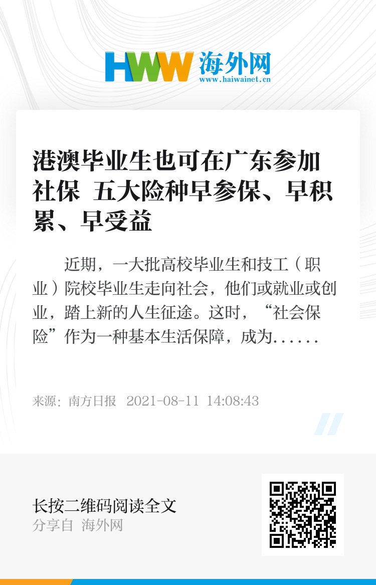 张琳表示,港澳毕业生也可在广东参保。随着粤港澳大湾区的融合发展,目前在粤工作的港澳毕业生日益增加。按照社会保险有关规定,在粤工作的港澳地区高校毕业生与内地高校毕业生享受同等待遇,即:有单位的由单位统一参保,灵活就业的可自愿按灵活就业人员规定参保。