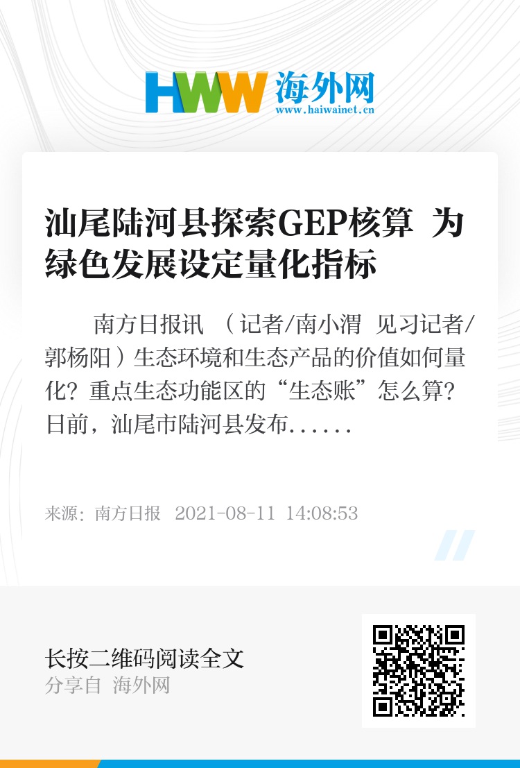 南方日报讯 (记者/南小渭 见习记者/郭杨阳)生态环境和生态产品的价值如何量化?重点生态功能区的“生态账”怎么算?日前,汕尾市陆河县发布了《2019年陆河县生态系统生产总值(GEP)核算成果》。《成果》显示,2019年陆河县GEP价值量为456.89亿元,约为当年GDP的5.3倍。