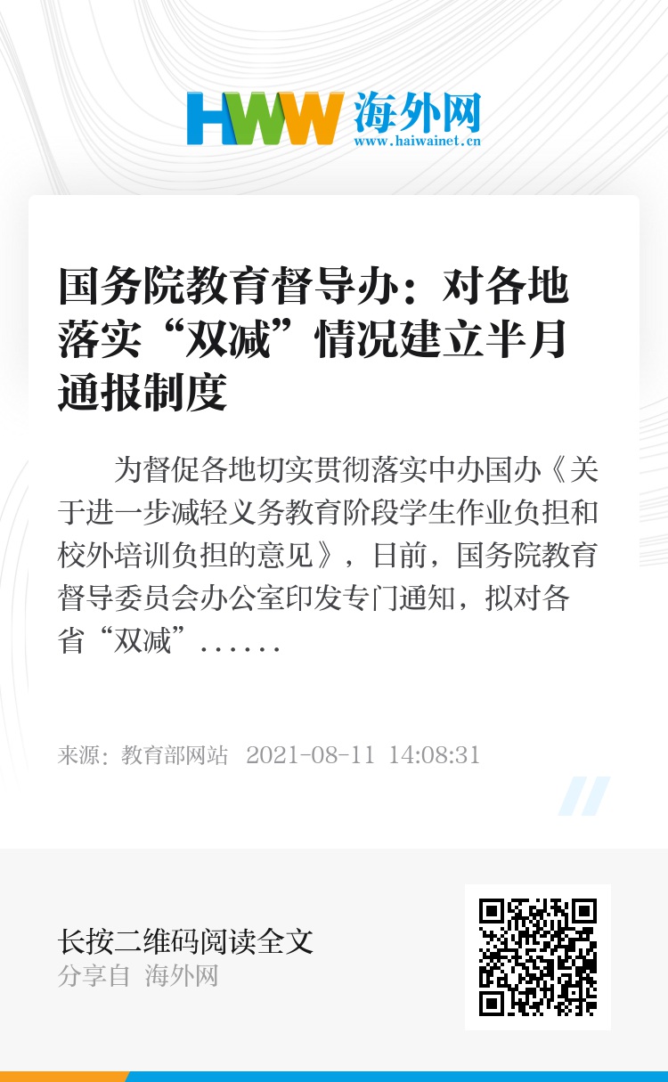 为督促各地切实贯彻落实中办国办《关于进一步减轻义务教育阶段学生作业负担和校外培训负担的意见》,日前,国务院教育督导委员会办公室印发专门通知,拟对各省“双减”工作落实进度每半月通报一次。