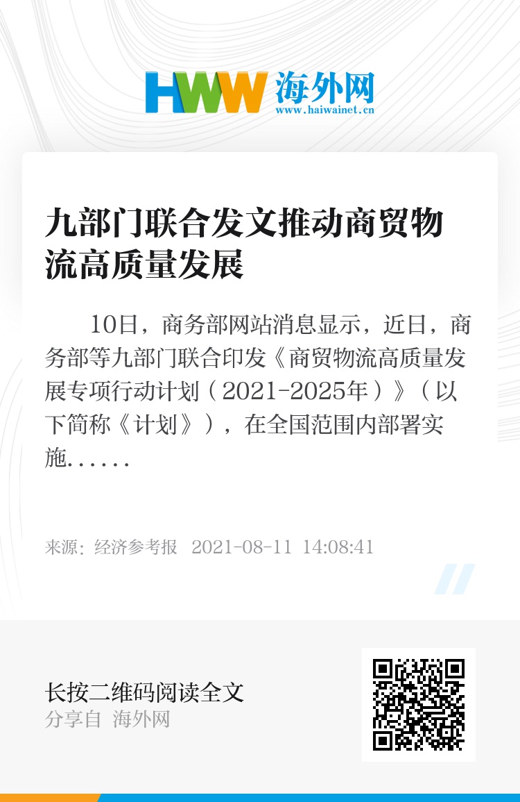 10日,商务部网站消息显示,近日,商务部等九部门联合印发《商贸物流高质量发展专项行动计划(2021-2025年)》(以下简称《计划》),在全国范围内部署实施专项行动。《计划》针对我国商贸物流领域的短板和不足,提出了优化商贸物流网络布局、建设城乡高效配送体系、促进区域商贸物流一体化、提升商贸物流标准化水平、发展商贸物流新业态新模式、加快推进冷链物流发展、培育商贸物流骨干企业等12项重点任务,进一步提升商贸物流服务质量和效率,降低商贸服务业和国际贸易物流成本。