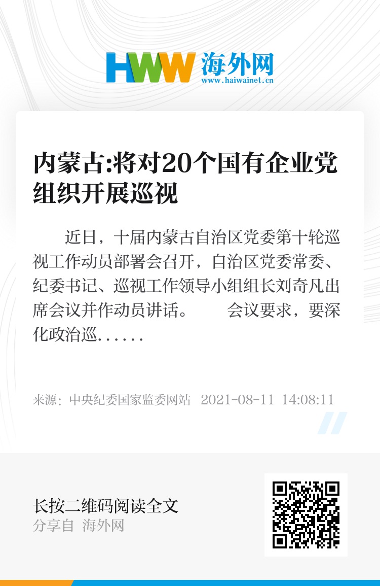 本轮巡视将派出10个巡视组,对内蒙古国有资本运营有限公司、内蒙古产权交易中心有限责任公司、内蒙古财信投资集团有限公司、内蒙古日信担保投资(集团)有限公司、内蒙古农牧业融资担保有限公司、内蒙古再担保股份有限公司、内蒙古储备粮管理有限公司、内蒙古第一电力建设工程有限责任公司、内蒙古恒正实业集团有限公司、内蒙古正益实业集团有限责任公司、中国北方稀土(集团)高科技股份有限公司、内蒙古包钢西创集团有限责任公司、内蒙古土地资源收储投资(集团)有限公司、内蒙古地质工程有限责任公司、内蒙古公路交通投资发展有限公司、内蒙古航空旅游投资(集团)有限公司、内蒙古黄河工程局股份有限公司、内蒙古爱信达教育印务有限责任公司、内蒙古威信保安押运服务有限责任公司、内蒙古恒基建设工程施工图审查有限公司20个自治区国资委和区直单位管理的国有企业党组织开展监督检查。(内蒙古自治区纪委监委 || 责任编辑 王小宁)