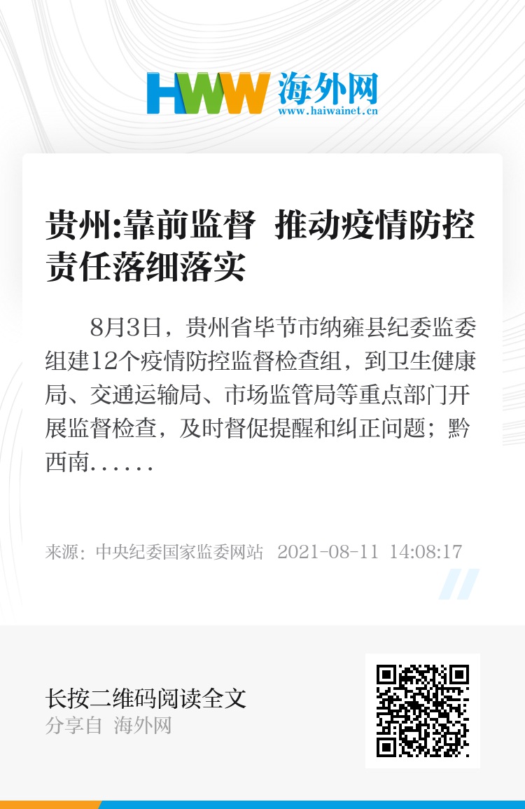 8月3日,贵州省毕节市纳雍县纪委监委组建12个疫情防控监督检查组,到卫生健康局、交通运输局、市场监管局等重点部门开展监督检查,及时督促提醒和纠正问题;黔西南州纪检监察机关干部下沉抗疫一线,开展专项监督检查,督促落实首诊负责制和院感防控机制、“日报告、零报告”制度等疫情防控措施……