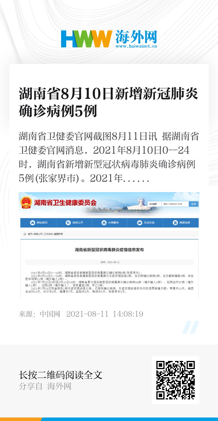 中国网8月11日讯 据湖南省卫健委官网消息,2021年8月10日0--24时,湖南省新增新型冠状病毒肺炎确诊病例5例(张家界市)。