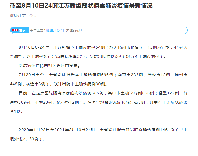 中国网8月11日讯 据江苏省卫健委微信公号“健康江苏”消息,8月10日0-24时,江苏新增新冠肺炎本土确诊病例54例(均为扬州市报告),13例为轻型,41例为普通型。以上病例均在定点医院隔离治疗。新增出院病例3例(均为本土确诊病例)。