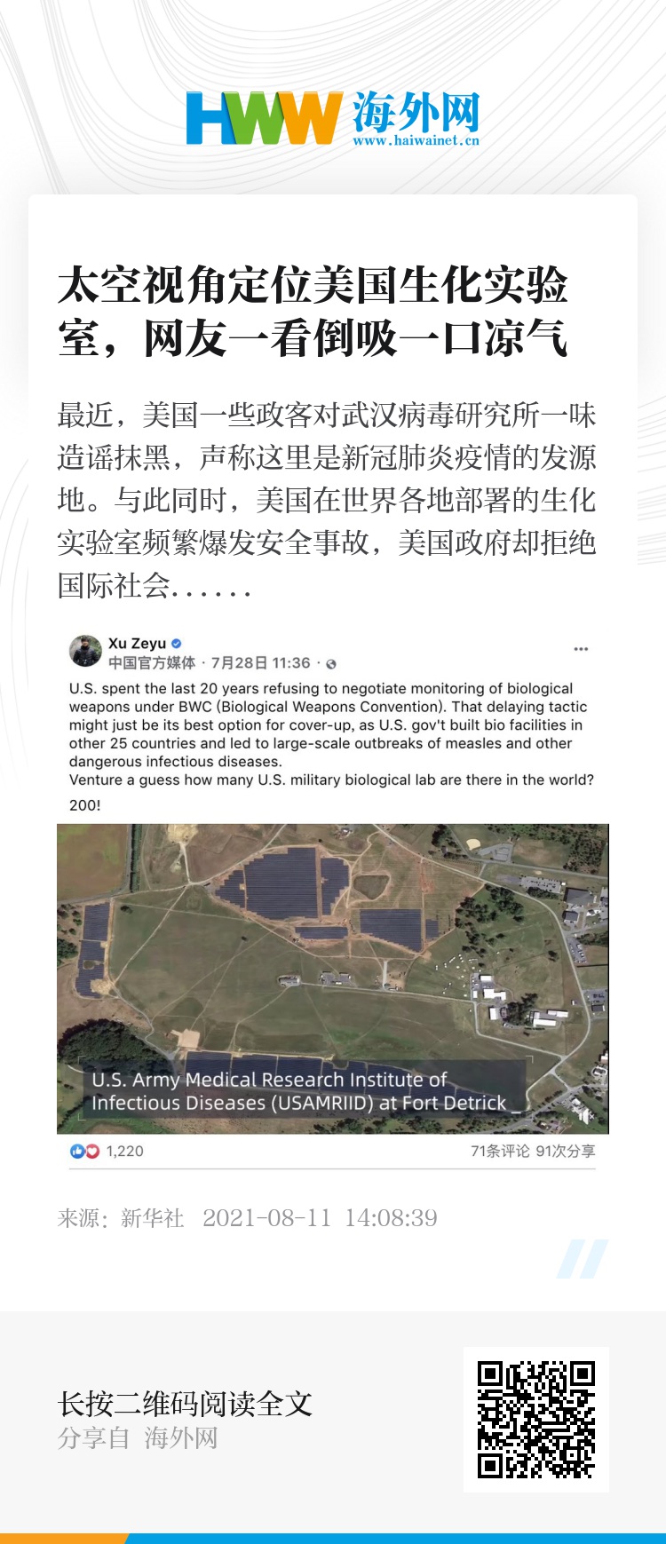 帖文写道:近20年来,美国一直拒绝重启《禁止生物武器公约》核查议定书的谈判。这一做法或许正是美国掩盖其秘密的最佳选择。美国在25个国家或地区建造生物实验室,并引发麻疹或其他危险传染疾病的大规模爆发。猜猜美国在世界建造了多少个生化实验室?200个!