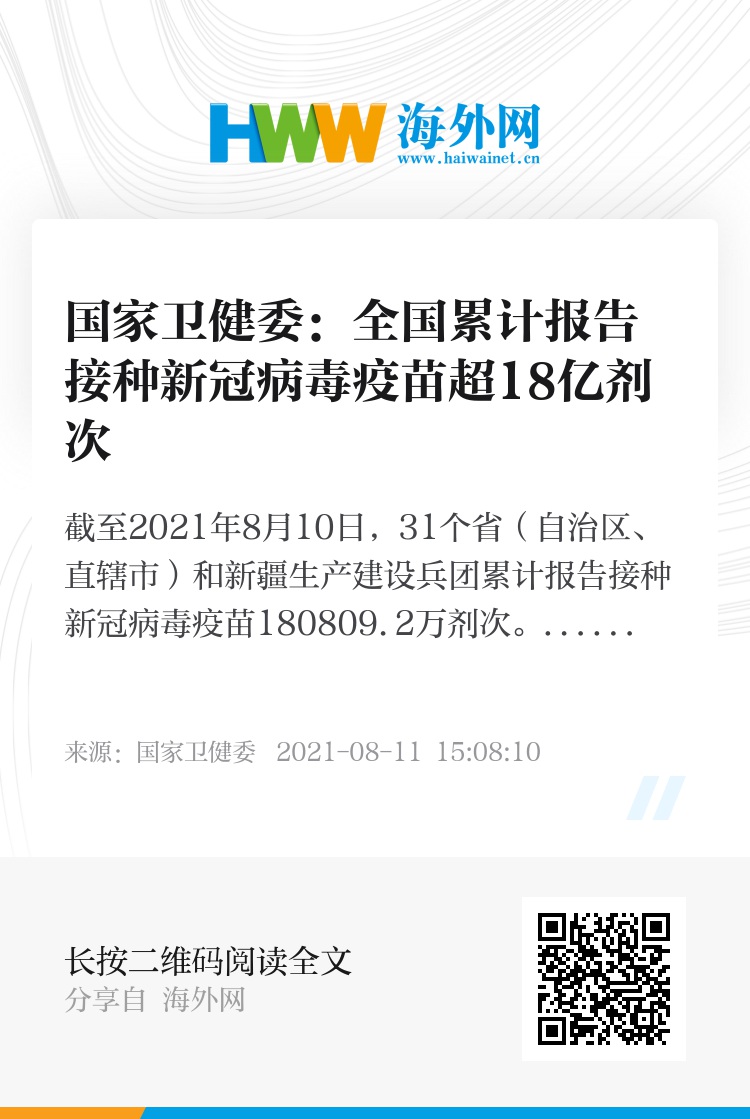 32191529,.国家卫健委:全国累计报告接种新冠病毒疫苗超18亿剂次,.2021-08-11 15:01:10,.204533,.余渺雪