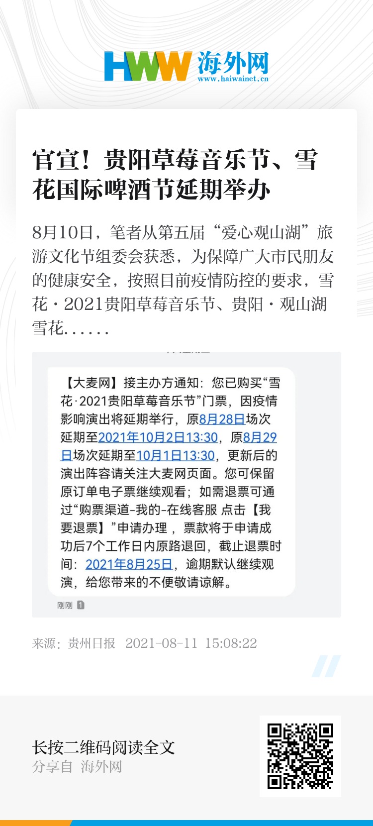 8月10日,笔者从第五届“爱心观山湖”旅游文化节组委会获悉,为保障广大市民朋友的健康安全,按照目前疫情防控的要求,雪花·2021贵阳草莓音乐节、贵阳·观山湖雪花国际啤酒节将延期举办。